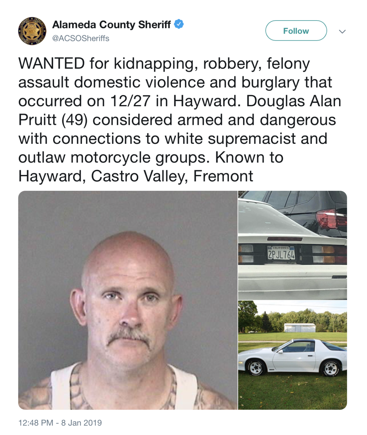 Bay Area Alameda Co. Sheriff seeks public’s help in finding suspect in violent attack By Jeff Shuttleworth | Bay City News | January 8, 2019 49 year-old Hayward man should be considered armed, dangerous, with connections to white supremacist and outlaw motorcycle groups