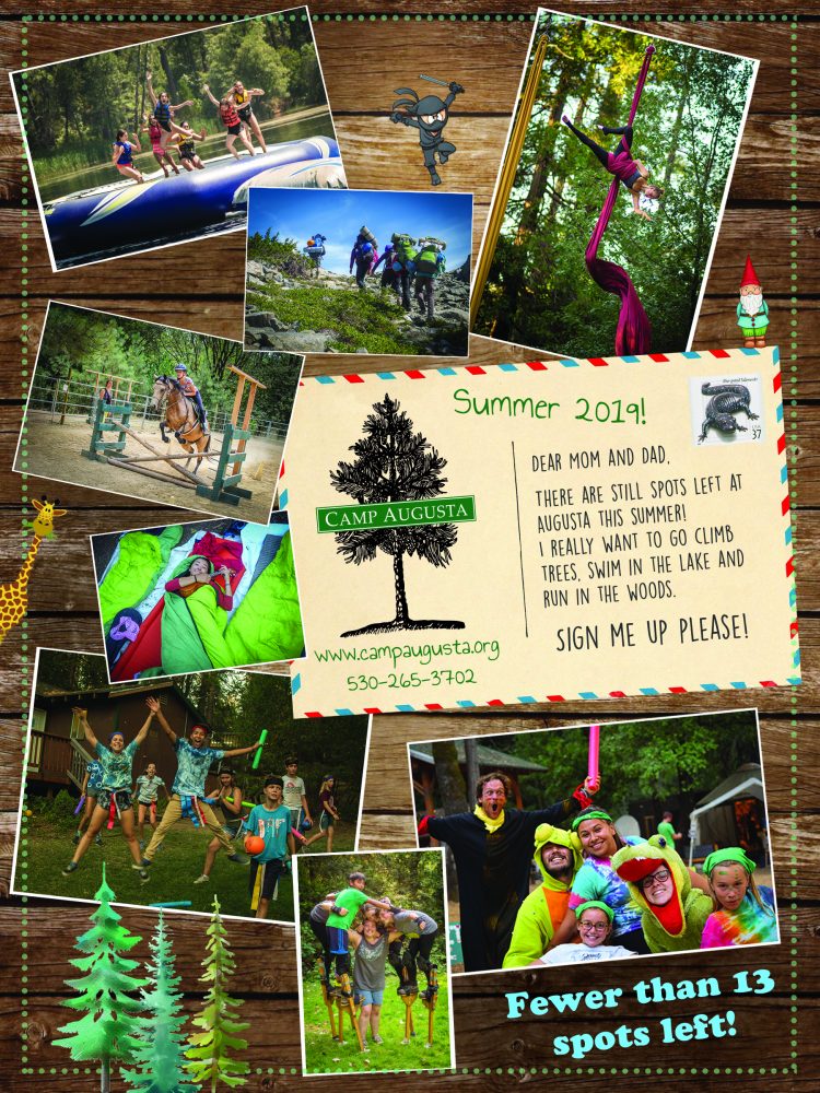 Still mapping out your child’s summer camp plans? Camp Augusta, a residential summer camp located in the Sierra Nevada, has thirteen openings left for this summer.