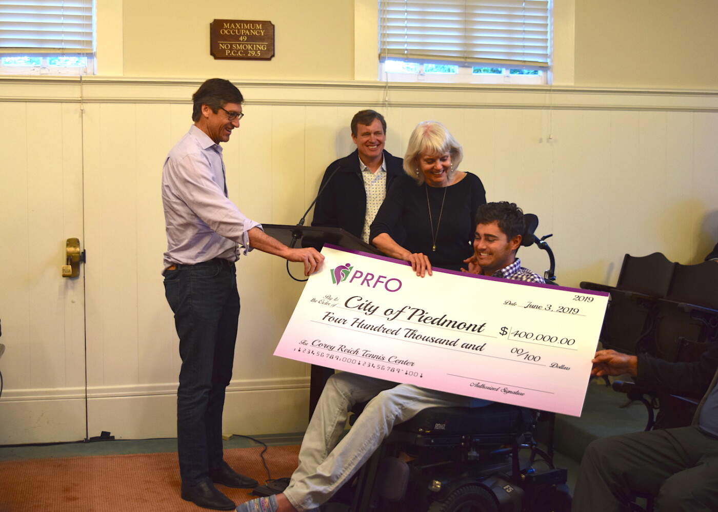 The $400,000 check from the Piedmont Recreational Facilities Organizational was the impressive first fruits of a community fundraising effort to establish the Corey Reich Tennis Center.