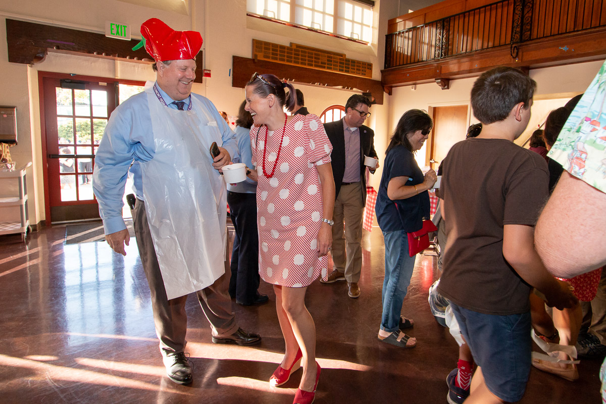 Chemistry teacher John Savage and computer science teacher Nathan Mattix serve up a bowl to parent George Zimmer