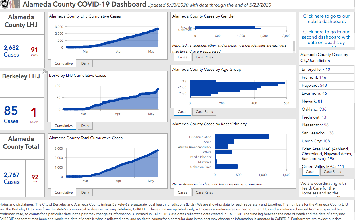 Oakland has 936, up from 910 reported cases on Friday. Berkeley (which has its own public health department and reports its numbers separately) has recorded 85, up from 78 reported cases on Friday, and 1 death.
