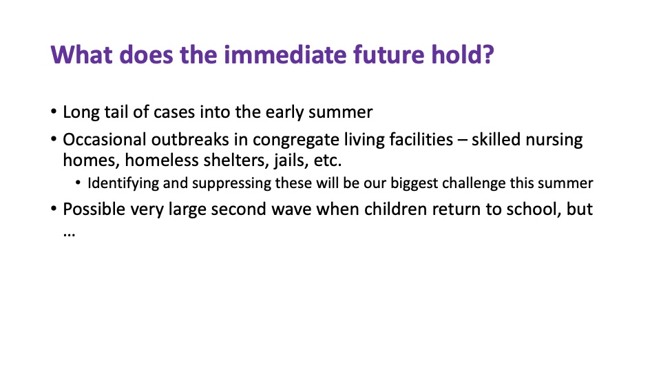 Contrary to some theories now circulating, herd immunity is not coming soon. “We are years away from this” Rutherford said. “We have to get a vaccine. This is serious, serious stuff. People are starting to back away from this. My job is to scare people.”