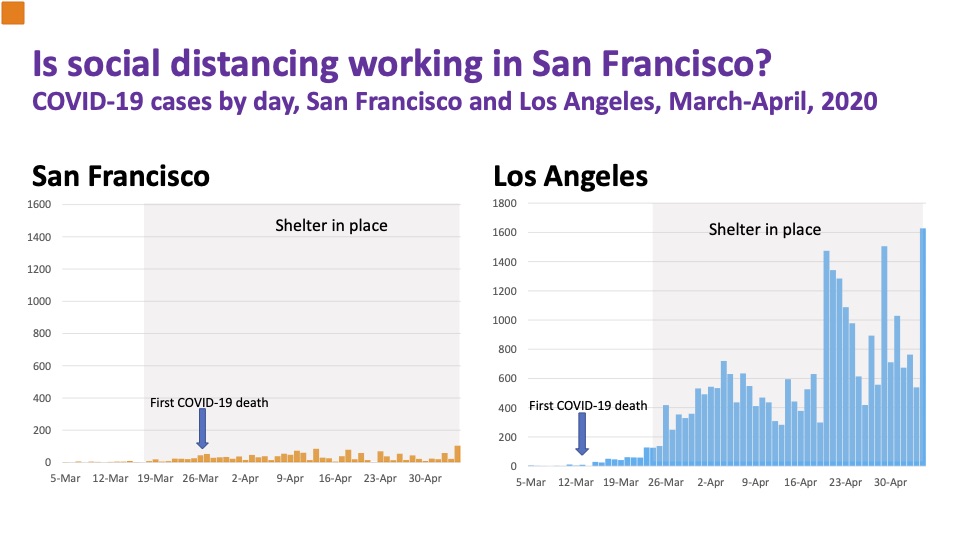 California has generally been successful in its measures and “The Bay Area has done remarkably well” in containing the spread of the virus, Rutherford said, even in stemming the transmission of the virus at facilities such as 750-bed Laguna Honda Hospital in San Francisco, where an outbreak has been limited to five patients and 16 staff members. Without protective measures, new cases “can spread like wildfire” at nursing homes, homeless shelters and other group living situations.