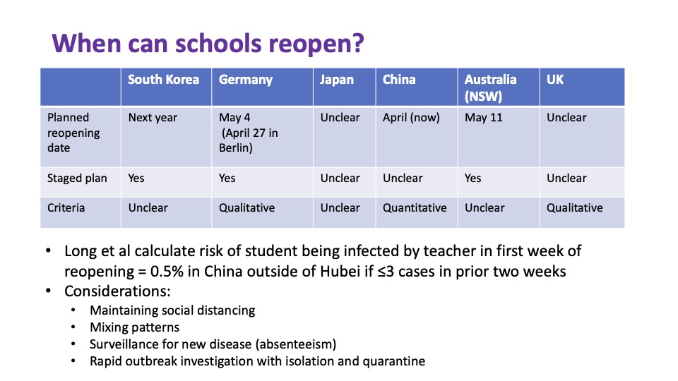 If schools do reopen, it should be with schedules that allow distancing, such as alternating attending smaller classes on certain days of the week and attending remotely on other days. School absenteeism should also be carefully examined, with a quick response of quarantine for suspected cases and isolation for confirmed cases. Without these steps, cases could leap again when school resumes.