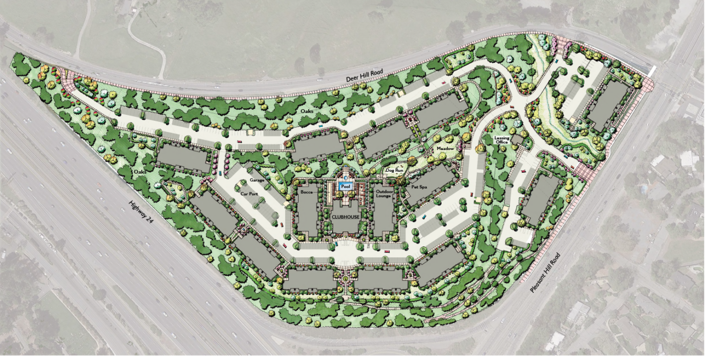 The Terraces of Lafayette project will sit on a 22-acre parcel on Deer Hill Road just west of Pleasant Hill Road and north of state Highway 24, near Acalanes High School. Plans are for seven three-story buildings and seven two-story structures.