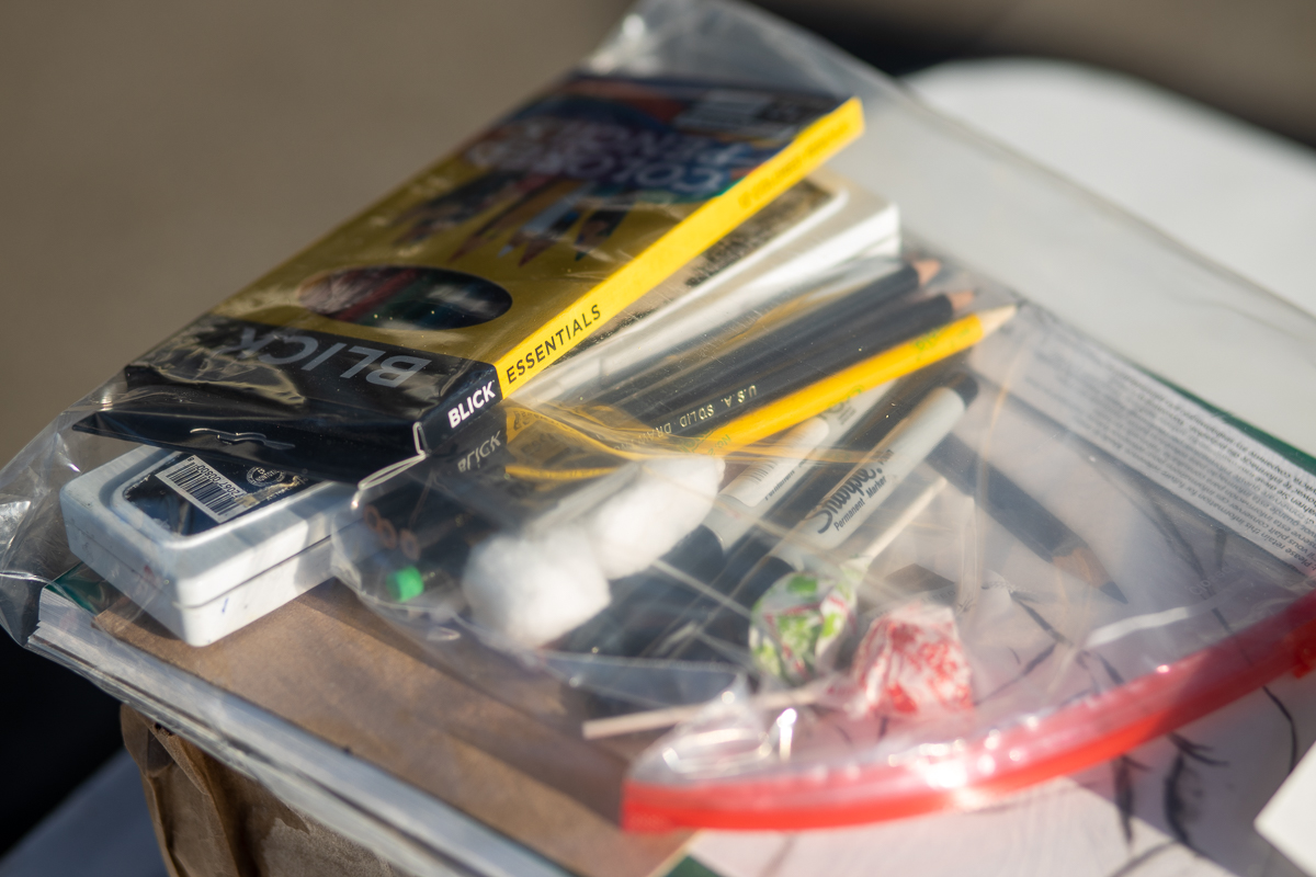 A parent volunteer hands a students supplies through the car window