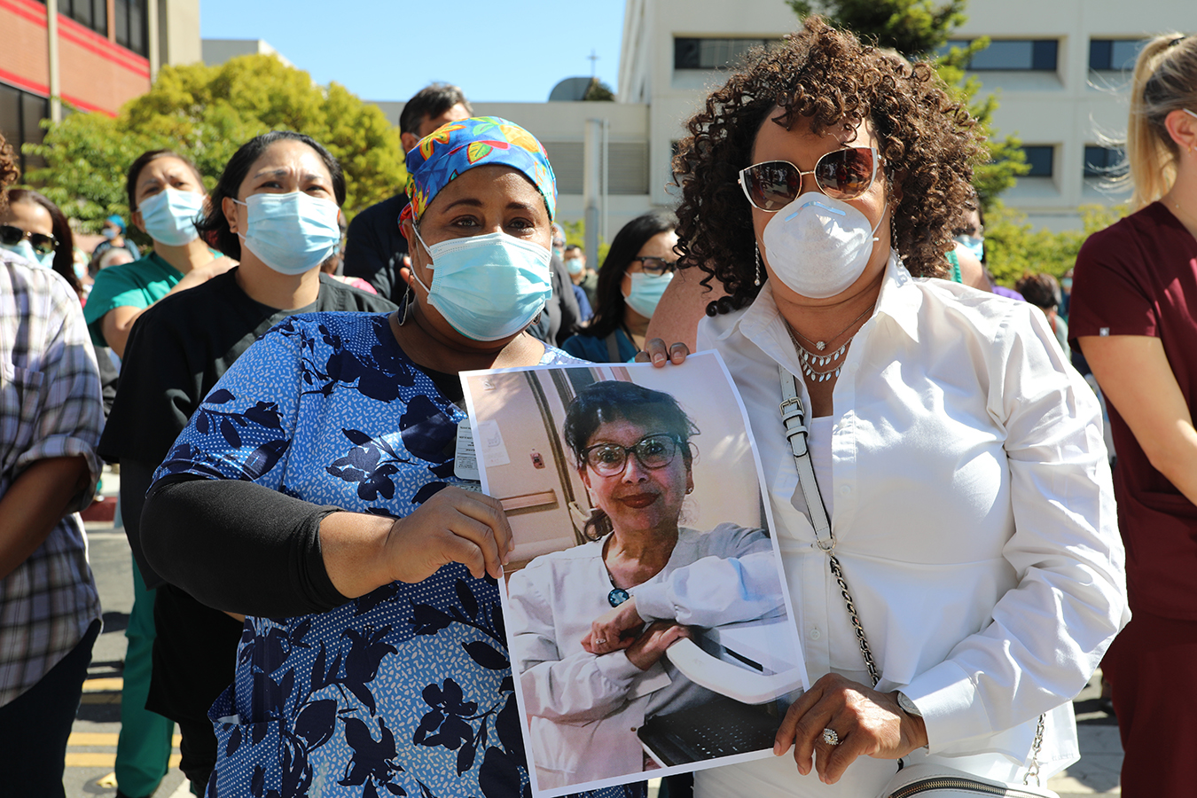 On July 21, 2020, registered nurses held a vigil at Sutter Health’s Alta Bates Summit Medical Center in Oakland, California, to remember their colleague Janine Paiste-Ponder, who died of COVID-19. California Nurses Association members had complained to Cal/OSHA about COVID patients being spread throughout the hospital and say the practice was a factor in her illness and death. (National Nurses United)