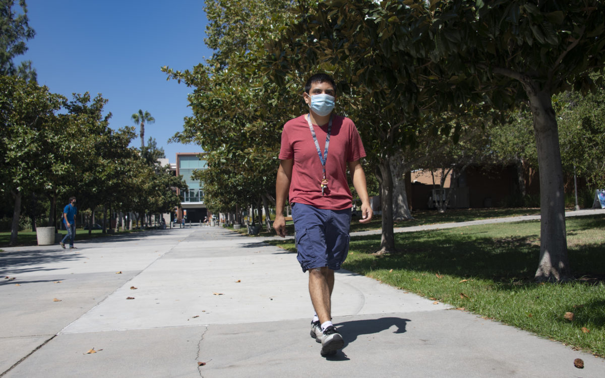 A masked student on CSU Northridge campus during the pandemic. (LEE CHOO/CSU NORTHRIDGE)