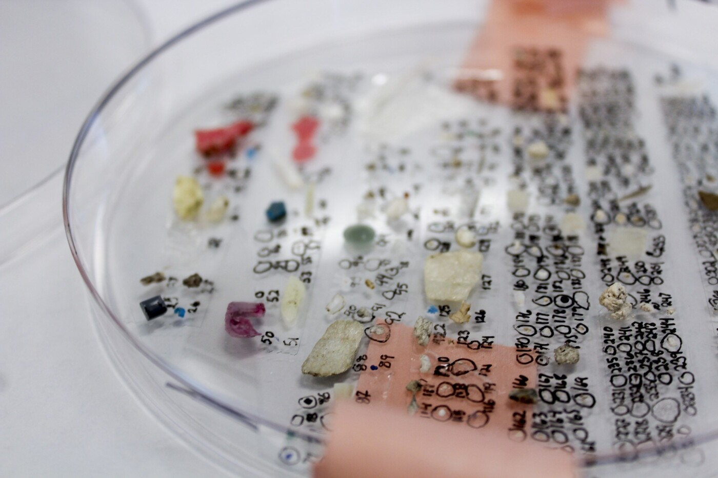 Slifko’s researchers filtered the water and then peered at the particles through microscopes. They picked out pieces of plastic with forceps, then put them on a petri dish lined with sticky tape to count them.