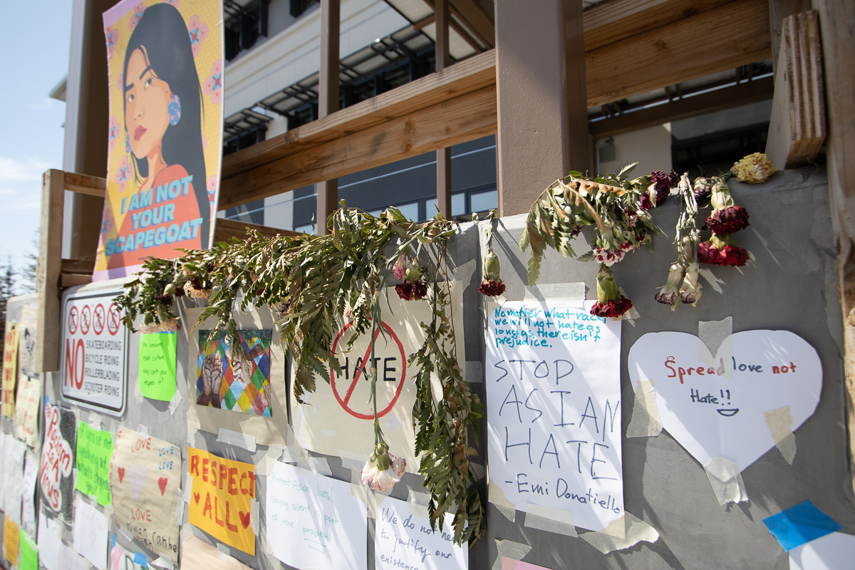 A pop-up “solidarity wall” created by members of the Piedmont Racial Equity Campaign (PREC) and Piedmont Asian American Club (PAAC) over the March 26 weekend was moved from the Exedra plaza to Piedmont High School this week. Art work, flowers, posters, and a cascade of notes of community support against anti-Asian violence are on display.