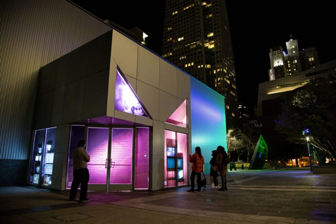 The installation is a mix of photography, video, glass painting, new media, poetry and large-scale projections. It can be found on the south and east facing windows and walls of YBCA adjacent to Yerba Buena Gardens.