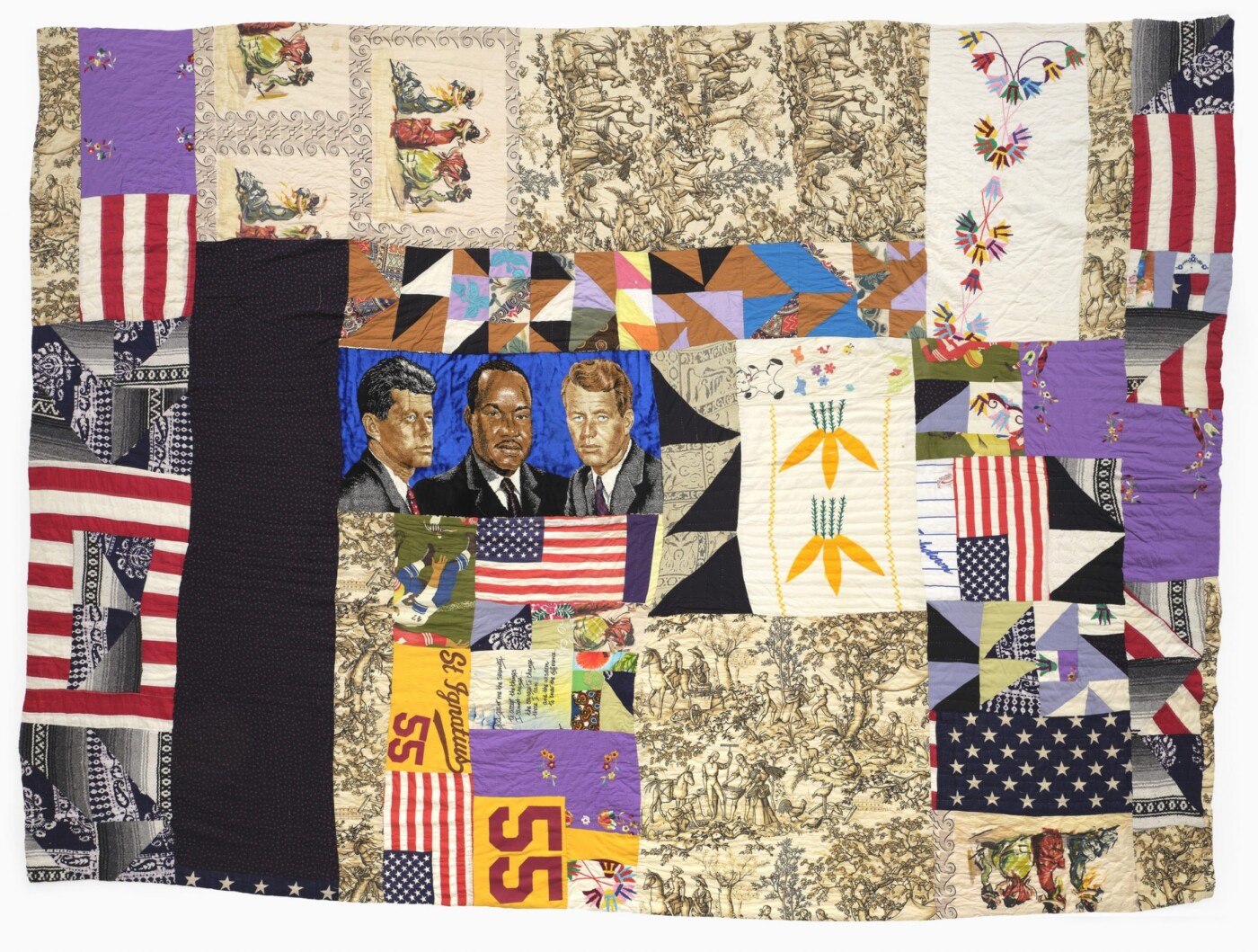 In another work from 1996, Tompkins joined a found dish towel portraying dancing figures with a manufactured religious tapestry, fragments of the American flag in blocks of stripes and half-squares of stars, and images of dogs, cats and chickens to create a patchwork that demands close attention.