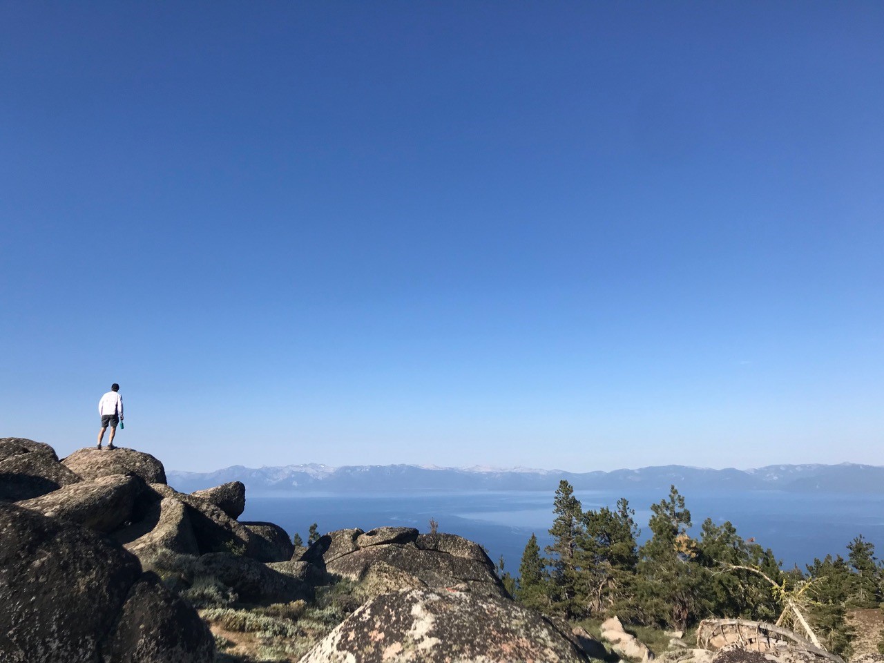 Trail highlights included Spooner Lake on the second day of the trip, and a Zen view of Gardnerville and Minden, NV from some rocks near our campsite. The third day featured panoramic views of Tahoe, including the entrance to Emerald Bay on the southwest, the full western shoreline, and Sand Harbor and Incline Village to the north and east. At one point we could see Marlette Lake, just east of Sand Harbor, with Tahoe seemingly starting just over the hill. Marlette campground featured a (cold!) water pump, which provided a re-supply of fresh water and a welcome cool-off from the heat. The fourth day highlight was a 1.5-mile side loop from the TRT to the edge of Marlette Peak, where the entire west and north sides of Tahoe opened up. We also enjoyed great views of Washoe Lake and surrounding communities to the east.
