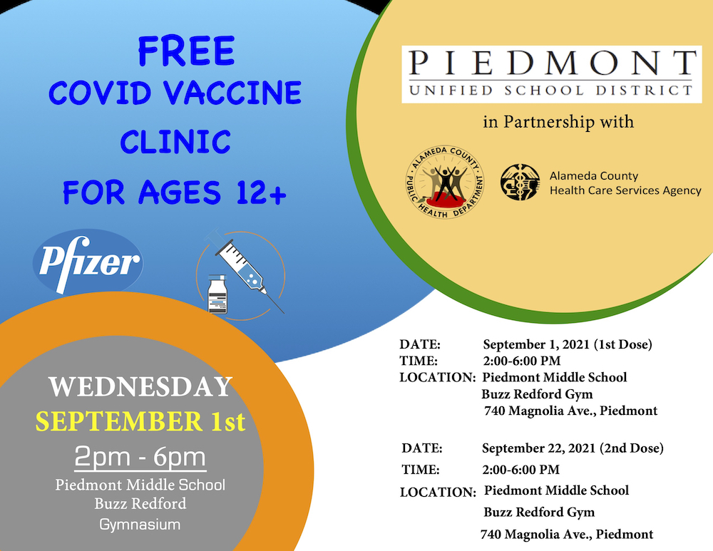 Newly FDA-approved Pfizer vaccine available to all Piedmont community members, city staff, PUSD teachers, staff, and students (ages 12+).