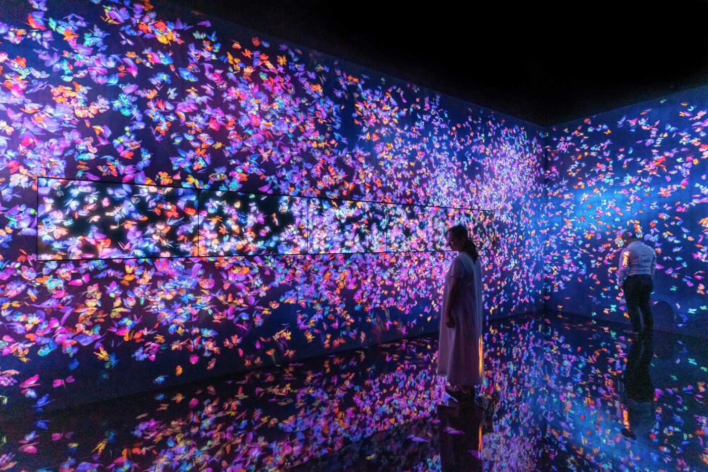 On a busy Saturday afternoon in August, visitors of all ages pace around the mysterious entrance to the digital exhibition, counting the minutes until they can enter. And then, we’re in! The darkened maze of rooms and mirrors consumes us, and we’re immersed in teamLab’s digital world of flowers, birds and butterflies that swirl and sparkle from wall to wall and floor to ceiling.