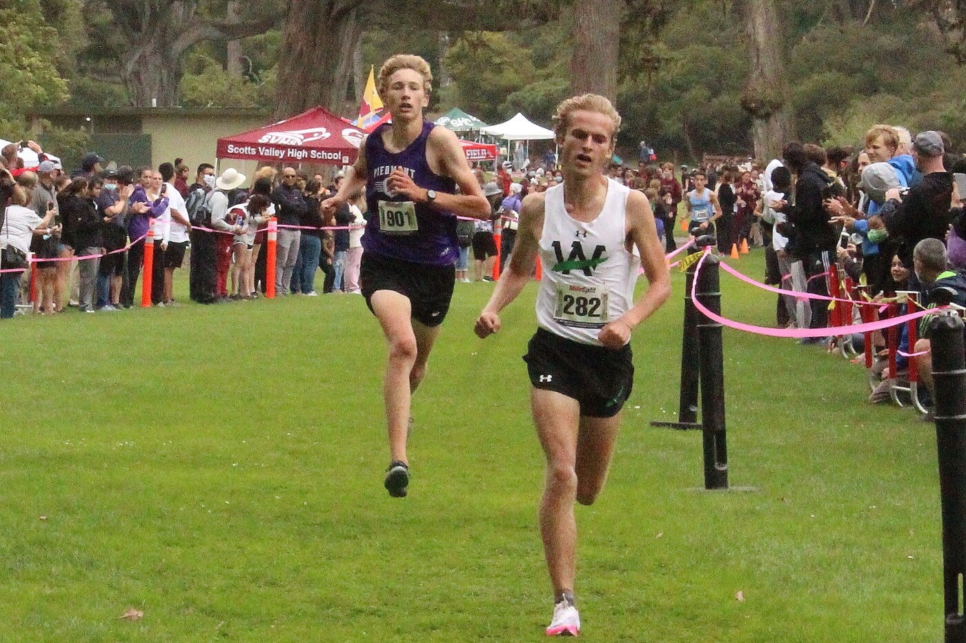 Xander Schulte-Sasse battles Ian Knight of Bellarmine-San Jose near the finish.