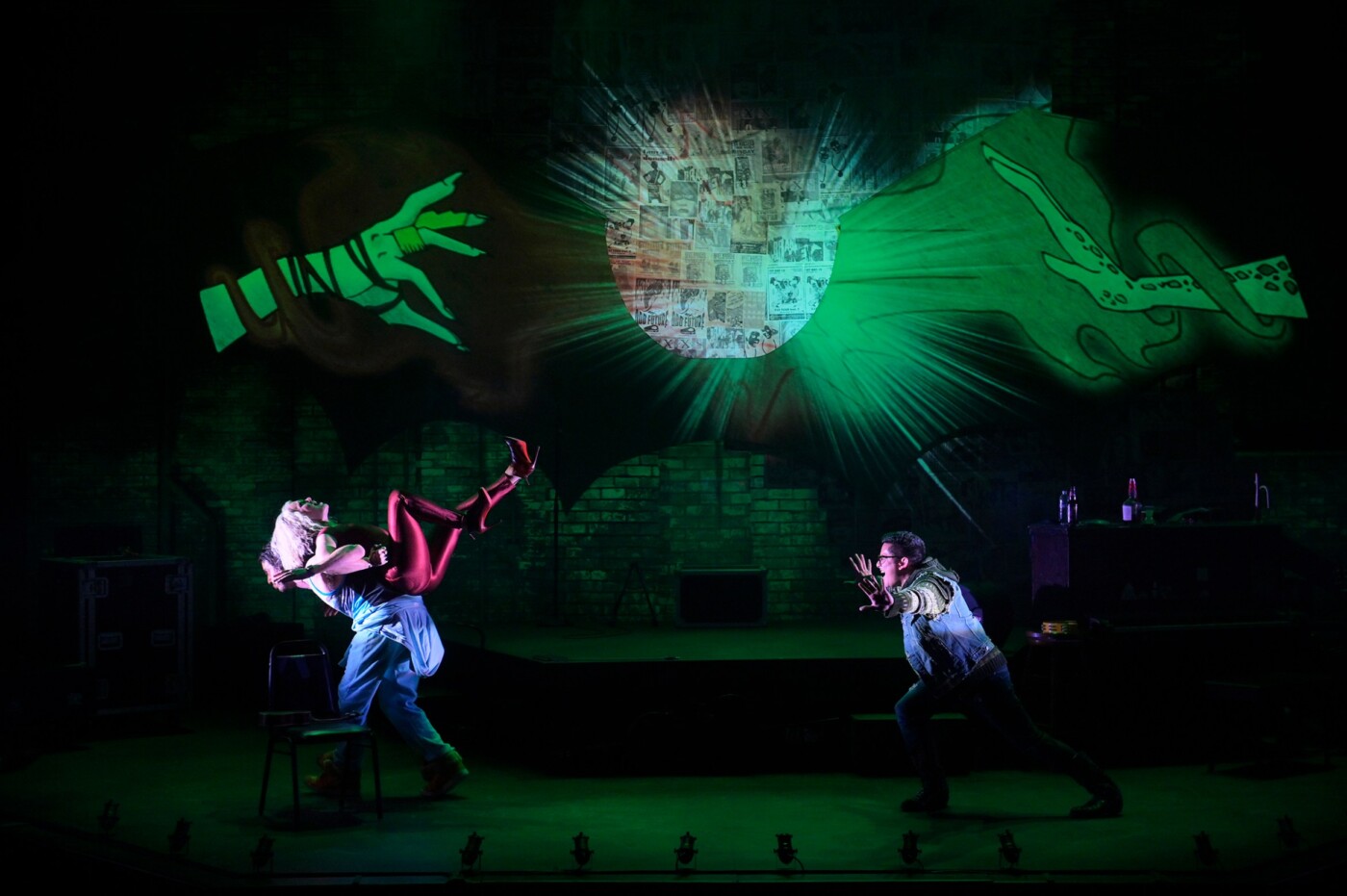 Some of the superhero comic-book type action plays out via overhead projections, Huertas explains, but only for aspects of the story that are not easily created on the stage. “One of the characters has the ability to grow claws out of her hand, and we can’t do that onstage, so we have this awesome illustration behind us to show you what the characters are seeing,” Huertas says. “Those projections are a really fun way to incorporate another one of my talents; I’m one of the illustrators.”