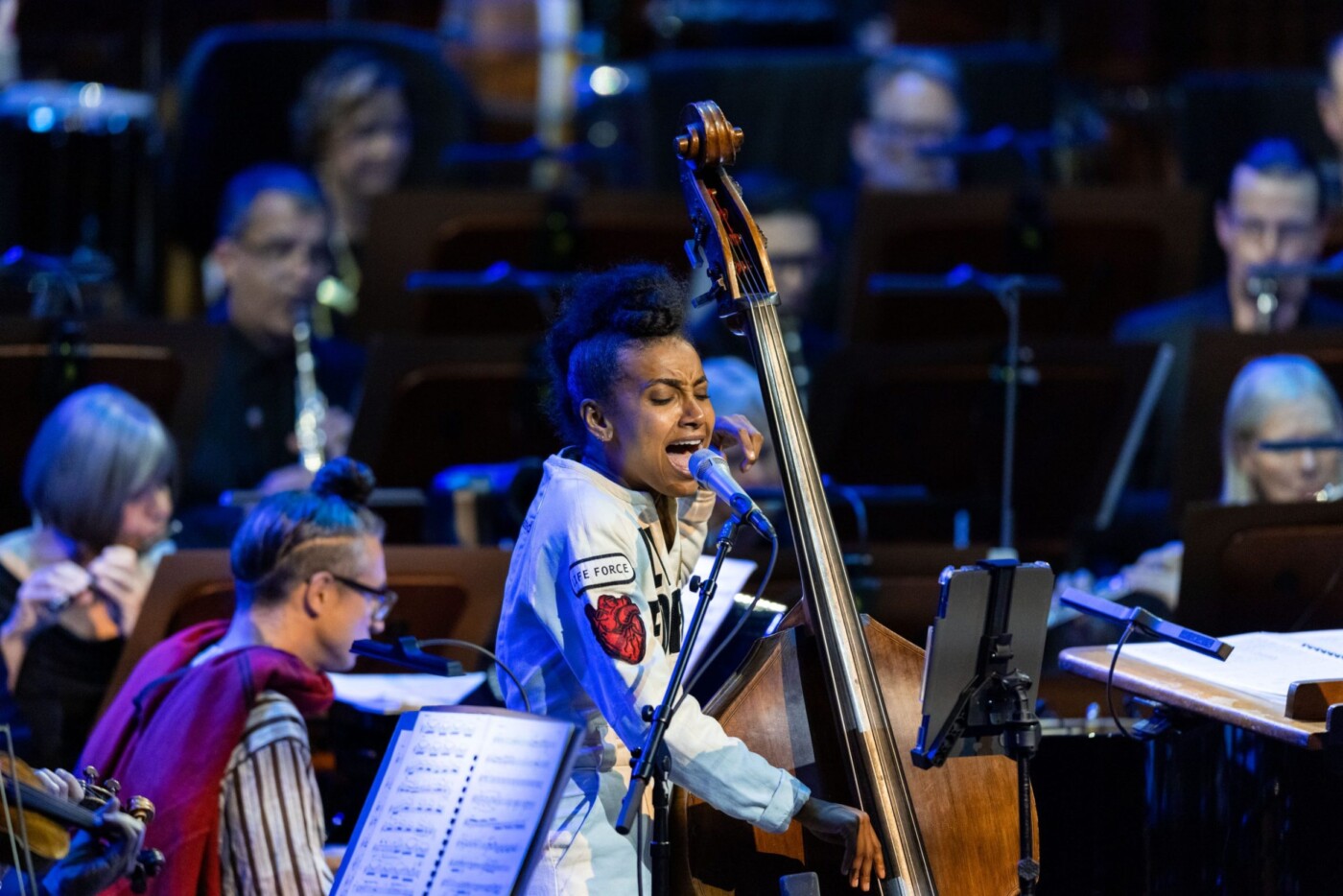 Jazzy, brash, inscrutable, shapeshifting — all these apply to Wayne Shorter’s “Gaia.” Shorter, a veteran of Miles Davis’ ensembles and the rare jazz musician with a degree in composition, has written a large, loose-limbed work (commissioned in 2013 by the Los Angeles Philharmonic), with little real architecture but spiked with opaque lyric flights matched vibrantly by singer-bassist Esperanza Spalding (Spalding and a select group are working with Salonen to expand the repertoire). The 20-plus minutes of music, played by a jazz quartet embedded in the orchestra, travels through unresolved climaxes to a smashing conclusion.