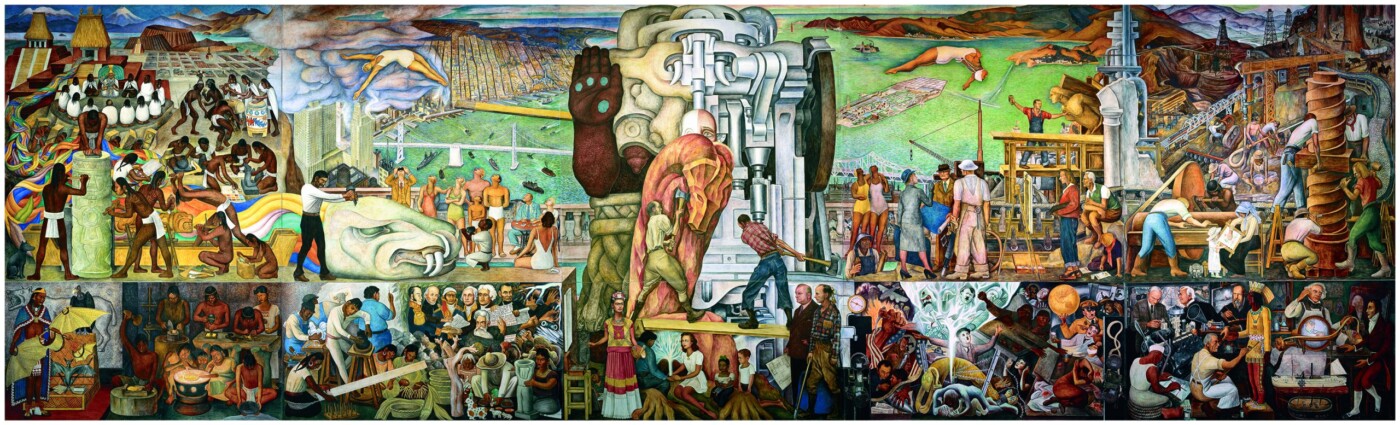 Before the limber figures, the picaresques, the colorized Aztec myths, before anything else, you’re confronted with the sheer scale of the towering fresco. Diego Rivera’s “The Marriage of the Artistic Expression of the North and of the South on the Continent” (1940), aka “Pan American Unity,” stands 22 feet high and 74 feet long, and it’s unlike any narration you’ve seen before. Summarizing the mural in a neat paragraph is a fool’s errand.