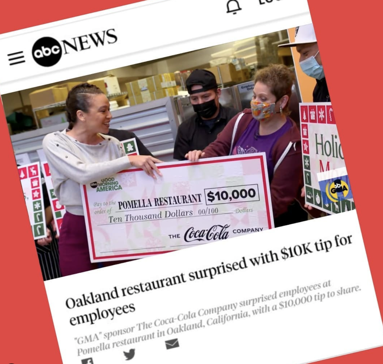 The popular California-Israeli restaurant Pomella at the bottom of Piedmont Avenue owned by Mica Talmor received a surprise $10,000 from Good Morning America sponsor the Coca-Cola Company to share among its employees. Talmor opened the restaurant just as the pandemic hit and, like many restaurants, has been able to keep going by pivoting to online orders. Talmor said in an Instagram post that GMA contacted her around Thanksgiving. Pomella kept the gift a secret from employees until the December holidays.