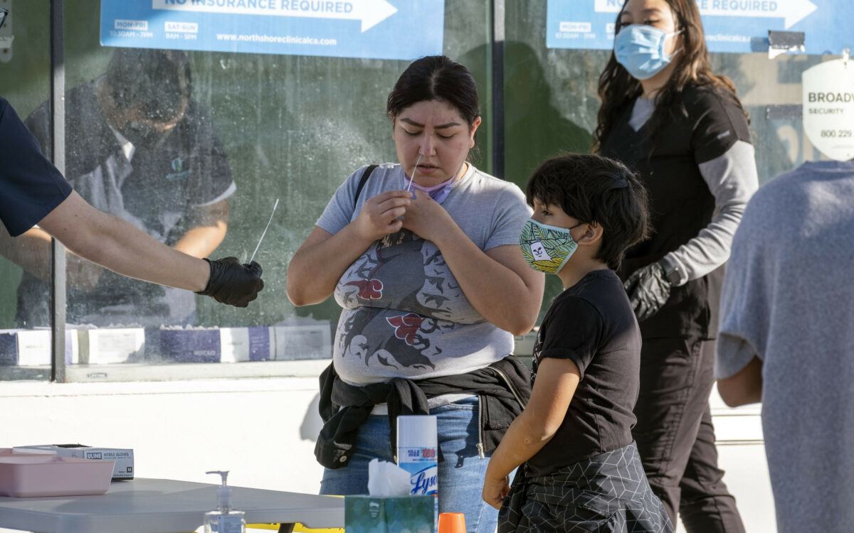 A woman self-administers a COVID-19 test at a testing site on Balboa Blvd and Saticoy St in Van Nuys, Calif., Tuesday, Jan 4, 2022. (Hans Gutknecht/The Orange County Register via AP)