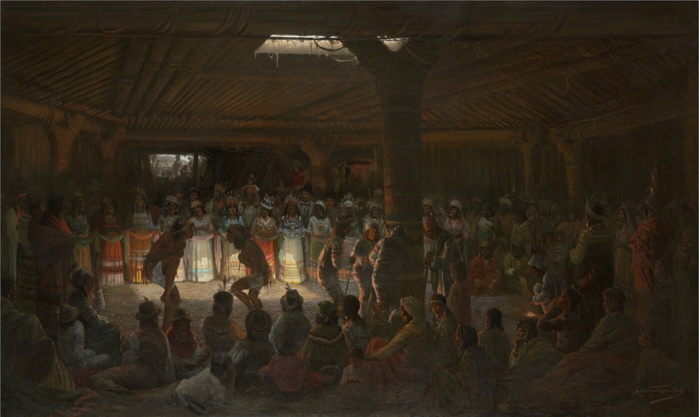 On the one hand, the painting celebrates the intergenerational power of the Pomo as they pray for protection against decimation. On the other, though, the ceremony is performed in the presence of a small cadre of white men, including a banker (Tiburcio Parrott), his business partner (Edmond de Rothschild) and their peers, emissaries of the culture carrying out the decimation.