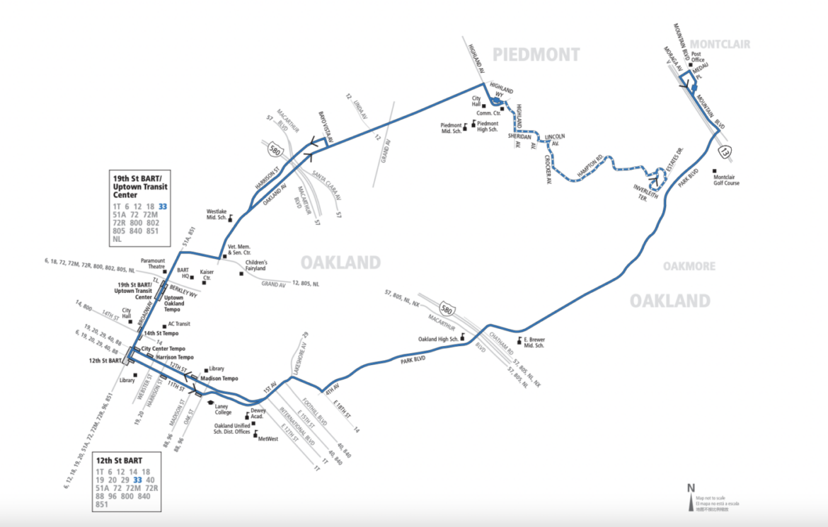 AC Transit will restart bus line 33 from Highland Avenue to Estates Drive starting August 7. The line, which loops from Highland Avenue to Inverleith Terrace and Estates Drive and then back down to Highland Avenue (with interim stops along the way) was shut down during the pandemic. The transit agency says weekday service on this route will increase to operate every 15 minutes during commute hours.