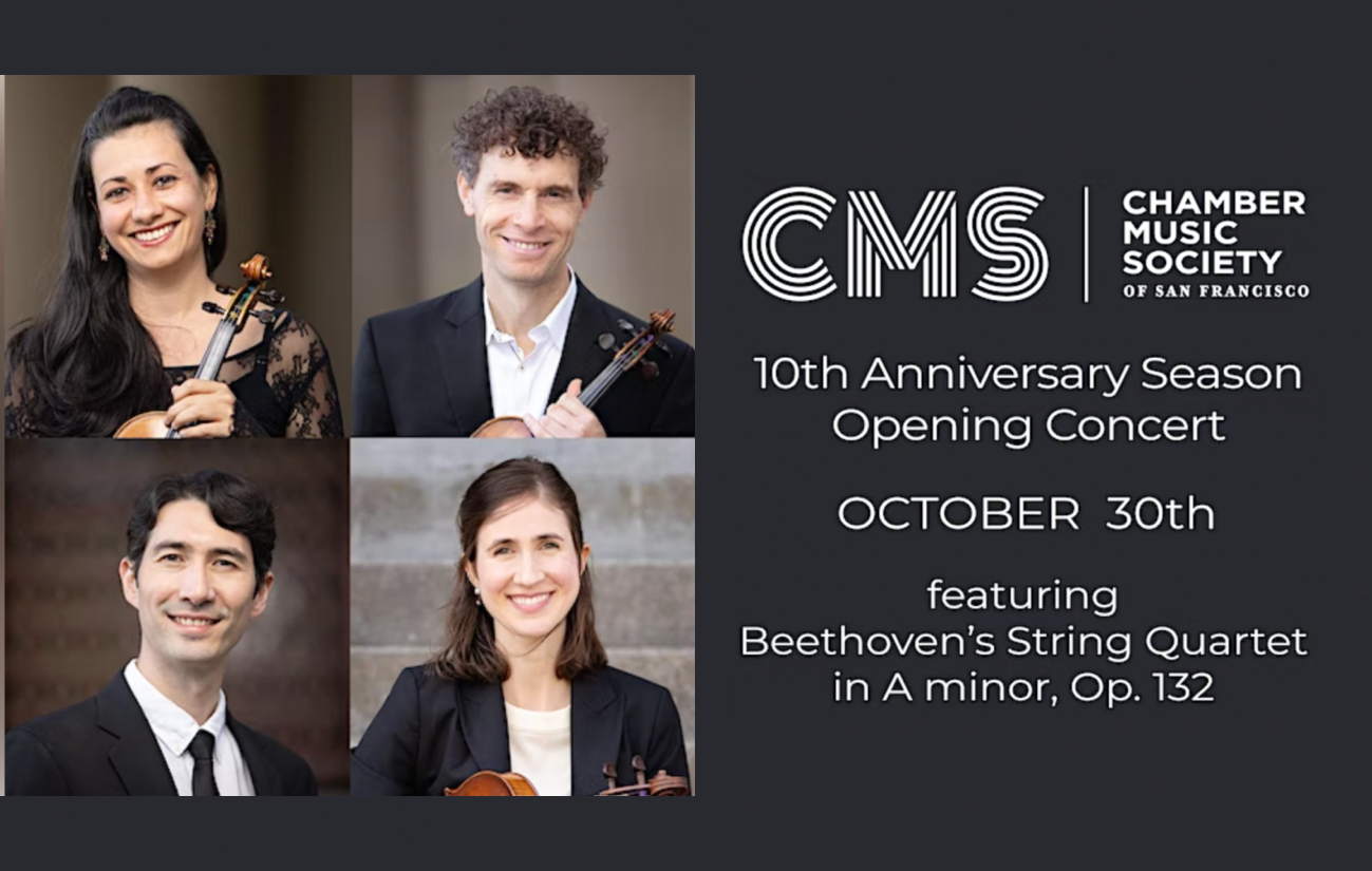 The Chamber Music Society of San Francisco distinguishes itself by bringing rich repertoire and impeccably performed programs to local audiences throughout the Bay Area. Launching its 10th anniversary season on October 30 at Piedmont Center for the Arts, the 90-minute concert postponed from September 17 has the quartet presenting Ludwig van Beethoven’s String Quartet in A minor, Op. 132, along with Wolfgang Amadeus Mozart’s String Quartet in C Major, K. 465 “Dissonance,” and Valencia, by composer Caroline Shaw.