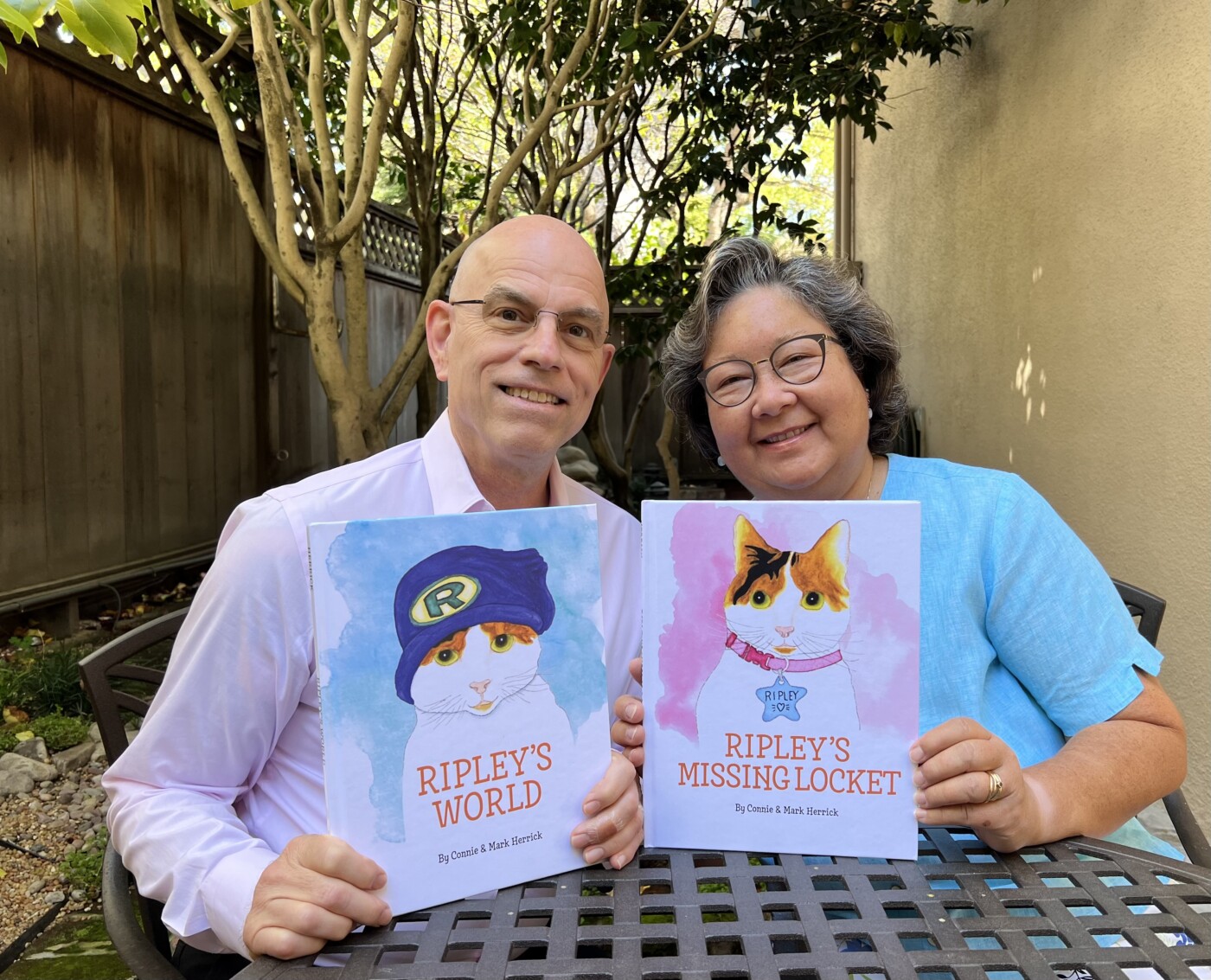Ripley’s Missing Locket, written and illustrated by longtime Piedmont residents Connie and Mark Herrick, is the latest addition to a children’s book series they started in 2021. The books, about a tiny, feisty, funny, calico kitty with a big imagination and her unique real-life family that includes two search and rescue German Shepherd dogs and an upside-down goldfish, were created for elementary school readers, and are filled with watercolor illustrations by Mark and story lines written by Connie.