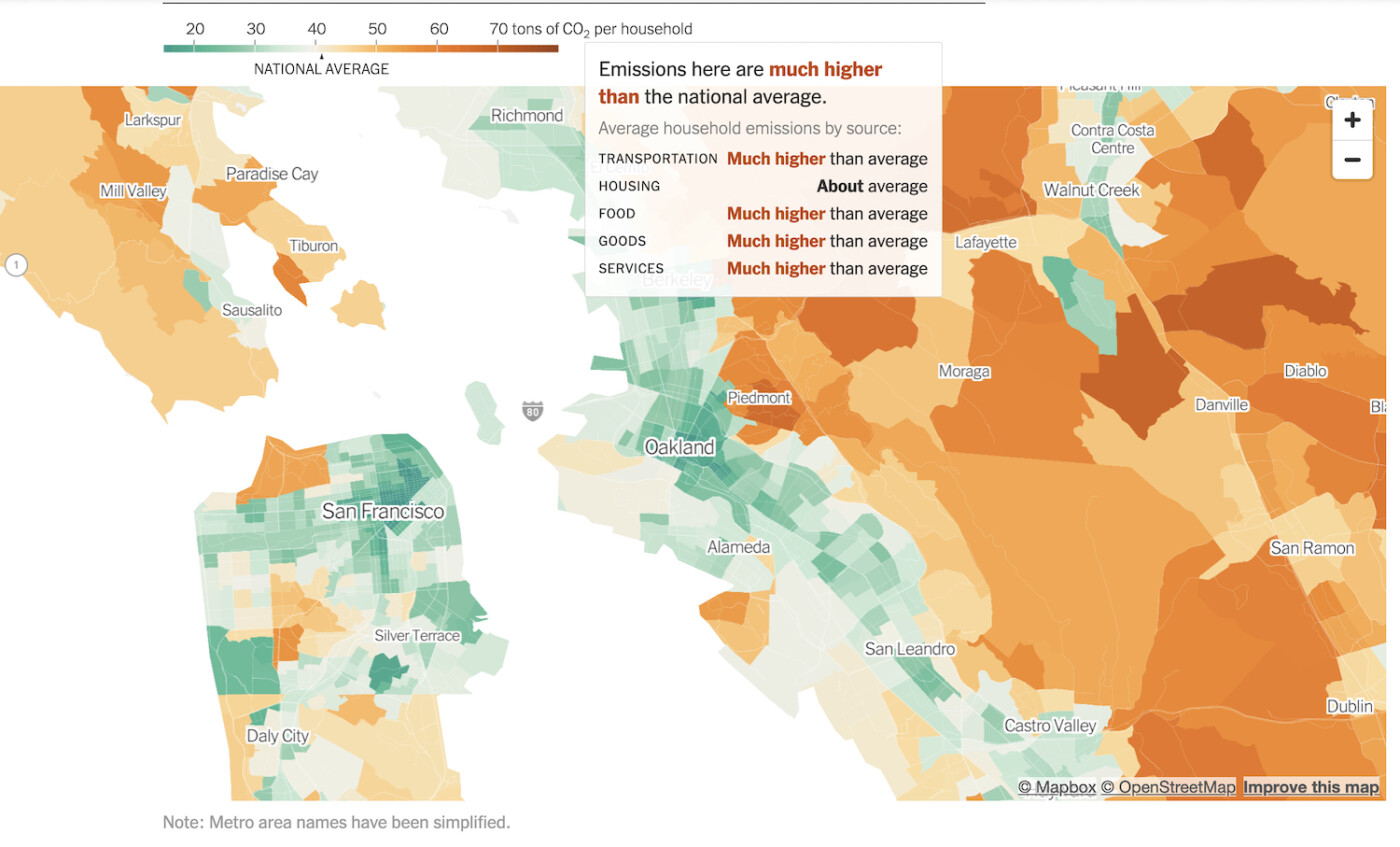 An interactive data journalism article in the Dec. 13 New York Times maps the climate impact of neighborhoods across the country. Piedmont, according to the mapping project, keeps company with other affluent suburban communities that have the dubious distinction of having some of the highest emissions footprints in the nation.