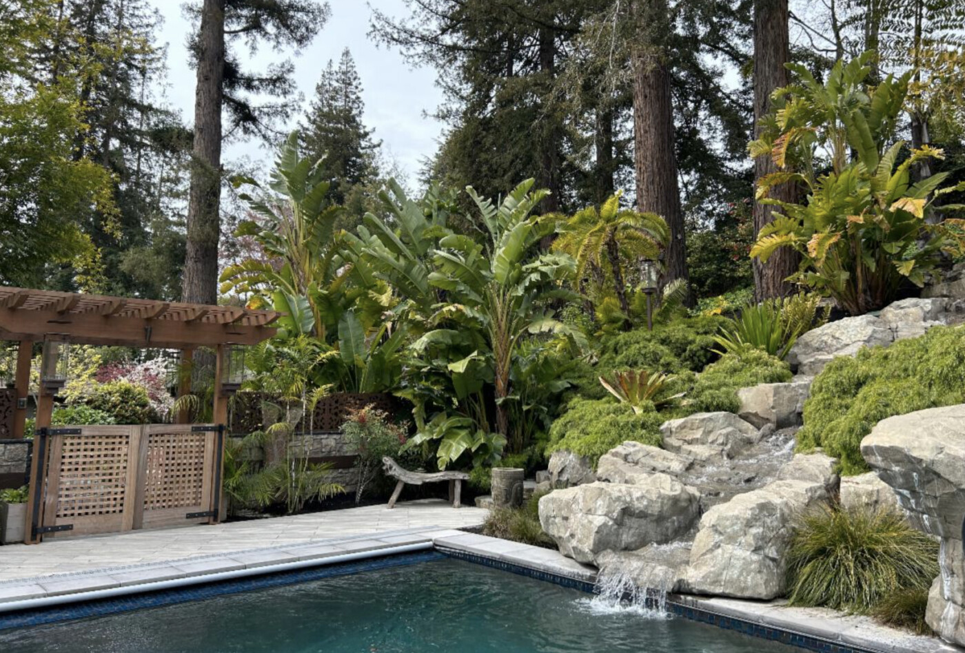 A pool, a palm, a shady path,