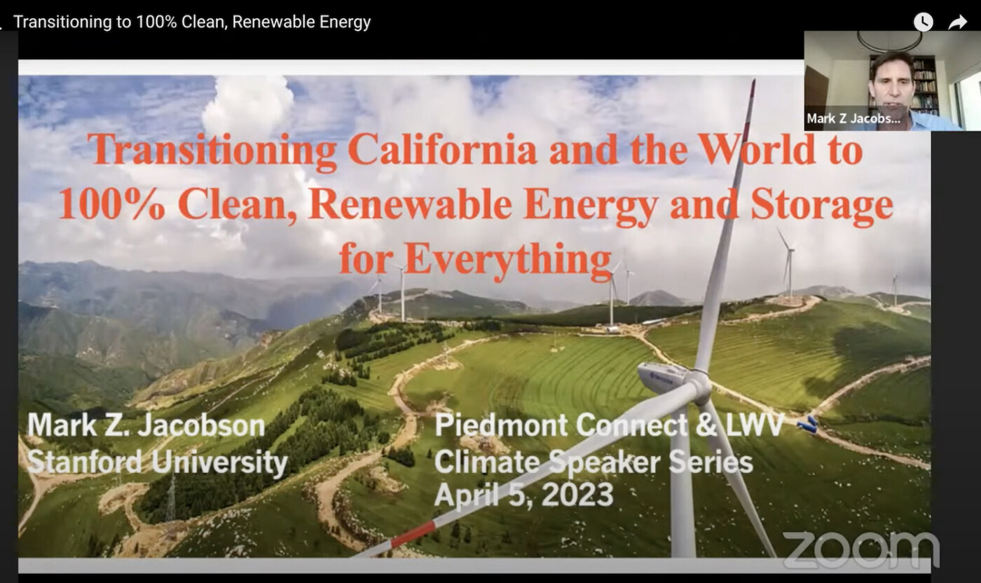 The League of Women Voters of Piedmont and Piedmont Connect on April 5 offered the sixth and final event in their jointly offered 2022-23 Climate Speaker Series. April’s lecture and discussion by award-winning scientist, author, and Stanford professor Dr. Mark Jacobson centered around the technologies and actions needed to provide 100% of the world’s energy with clean and stable renewable energy.
