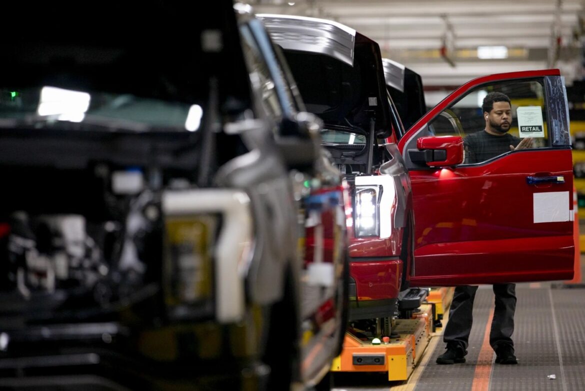 Amid the clank and clatter of the factory floor in Dearborn, Michigan, self-moving robotic vehicles transport the 1,600-pound batteries that power Ford’s flagship electric pickup truck to workers in various stations, who rush to bolt them to other parts.