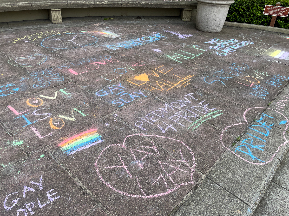 Students, teachers, and community members gathered at the Exedra Plaza on May 25 to publicly show commitment to equity and justice in the schools and in the Piedmont community. Organizers say around 50 people showed up to make posters or create chalk art after school that day.