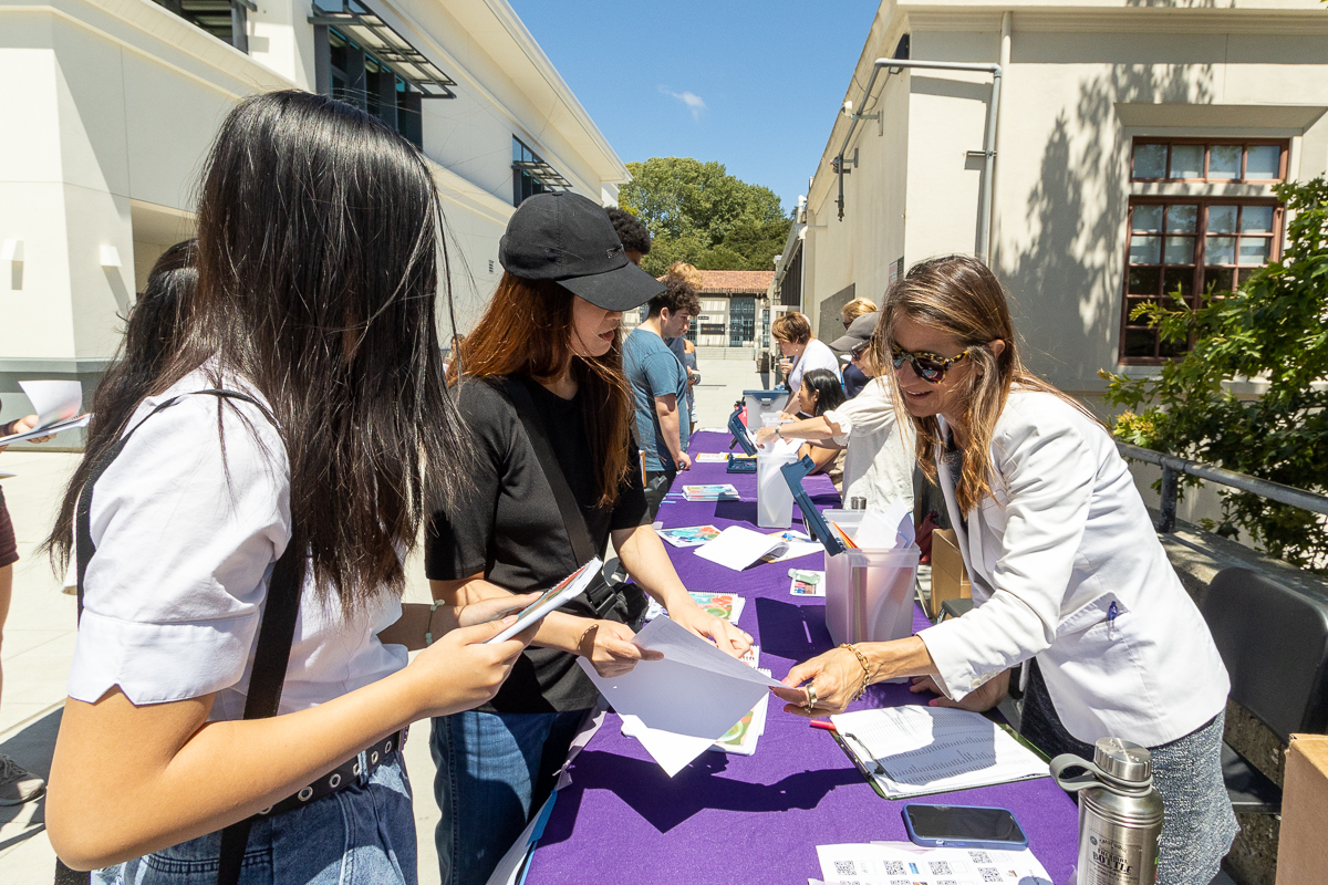 Parent volunteer Carrie McAlister hands out schedules and answers questions at one of the tables in the breezeway
