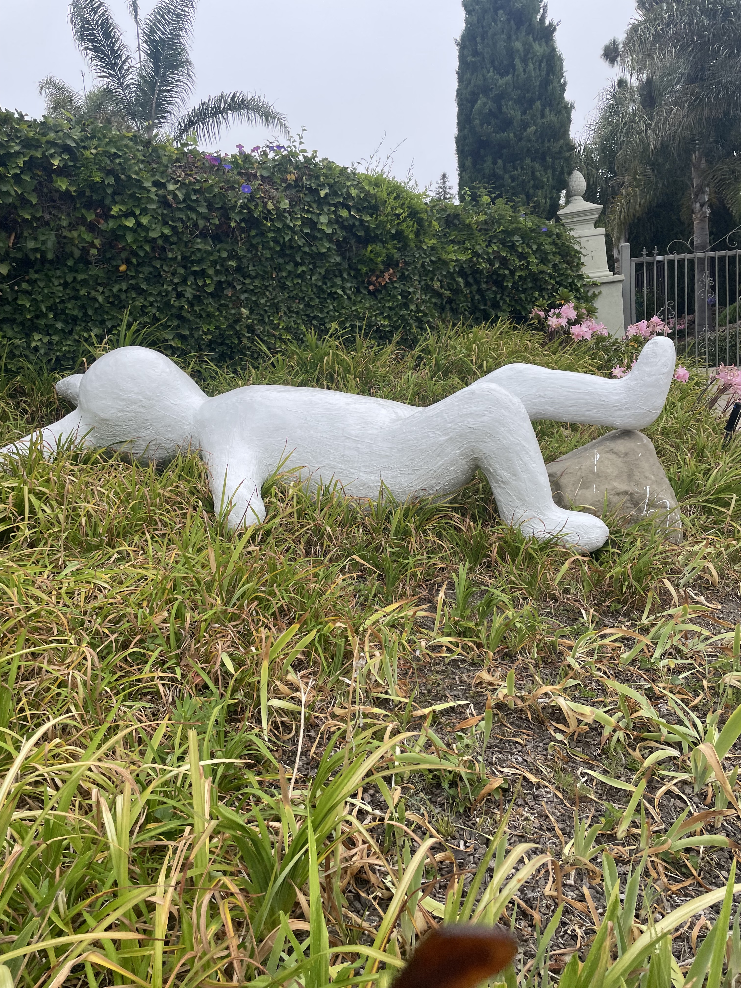 A reader shared a photo of the latest bunny sculpture to appear in Oakland sculptor Ama Torrance‘s yard in the Oakland Hills. Torrance’s larger-than-life whimsical fiberglass and plastic animals — donkeys, snails, and more — are familiar sights to those who make Oakland’s Pershing-Dawes loop part of their regular walking routine.