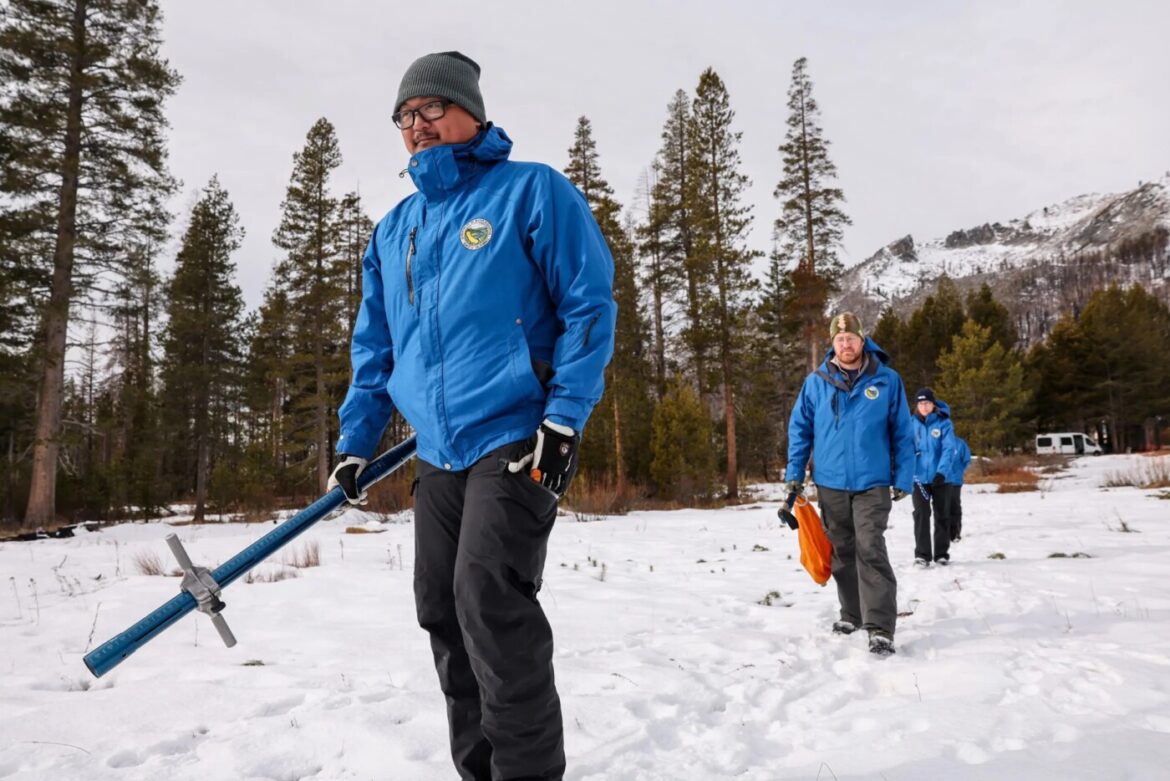 Tuesday’s manual measurement was done by the team of Sean de Guzman, the unit manager at the Phillips Station snow course in the Sierra Nevada, where snow measurements have been taken since 1941. It is one of 260 different snow courses measured statewide.