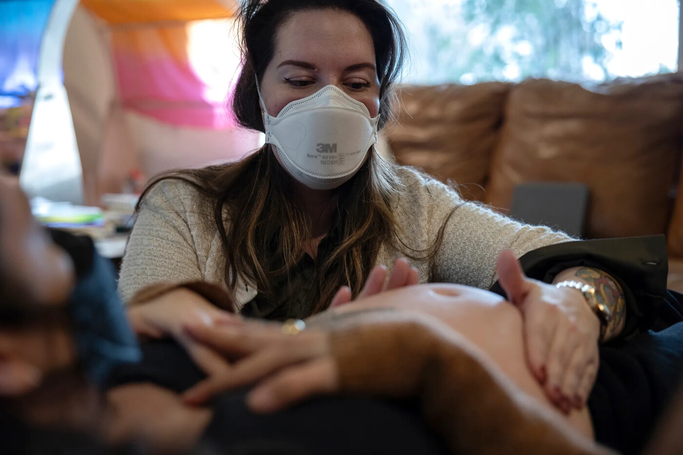 In a cozy house in Sacramento’s Oak Park neighborhood, Wisner has Chloé Mick lie back on her couch while her kids and husband play outside. Wisner measures the length of Mick’s uterus, feels for the baby’s position and they both listen to the baby’s heartbeat. Mick is 25 weeks pregnant and tired.