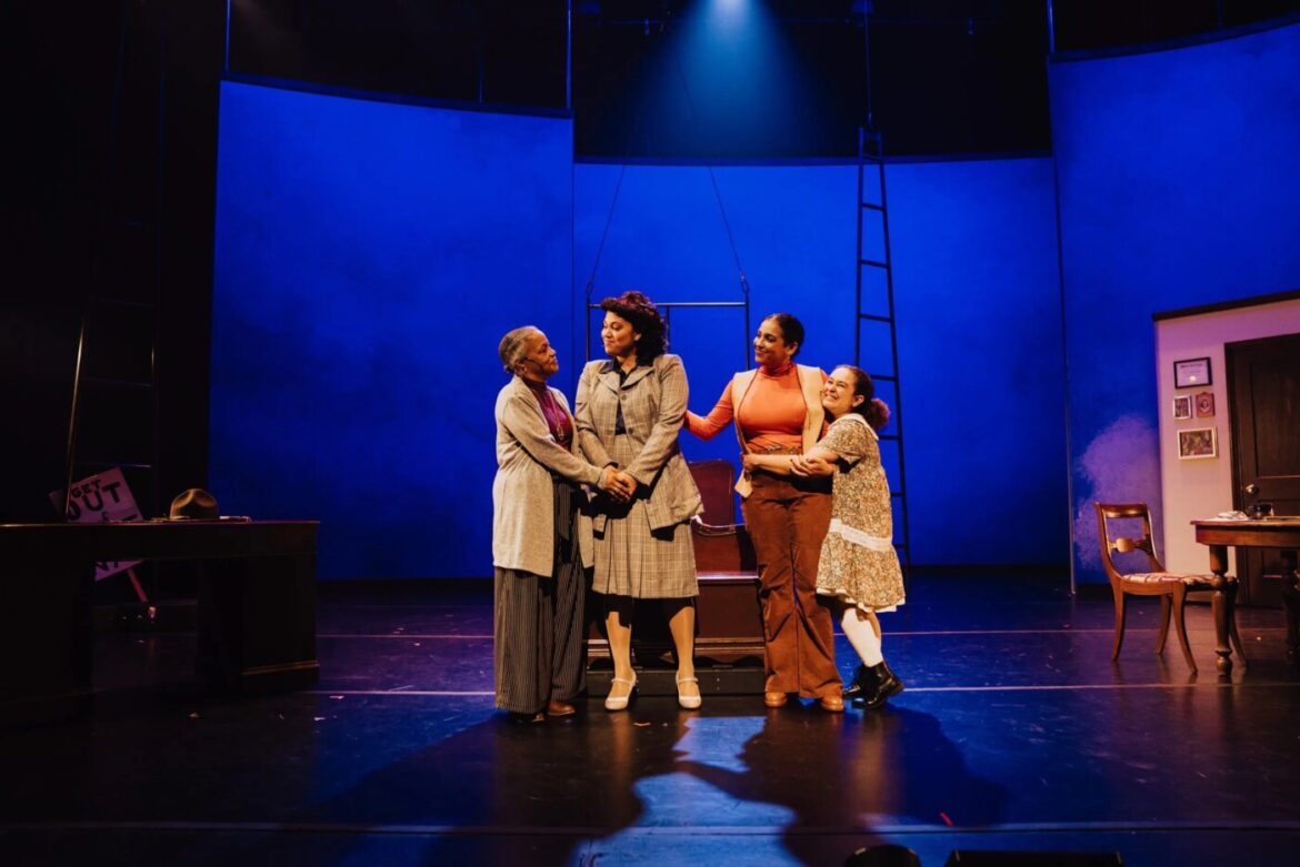 To trace the changes she’s gone through, Sullivan created four Bettys, all of whom interact at various times, forming a sort of historical timeline. There is little girl Betty (Tierra Allen), who functions as a vessel for the older Bettys to impart facts without being too didactic (although sometimes they are) and two older Bettys: Married Betty (Aidaa Peerzada, an especially powerful and soulful singer) and the more strident Revolutionary Betty (Lucca Troutman). Finally, there is almost-present-day Betty (Cathleen Riddley).