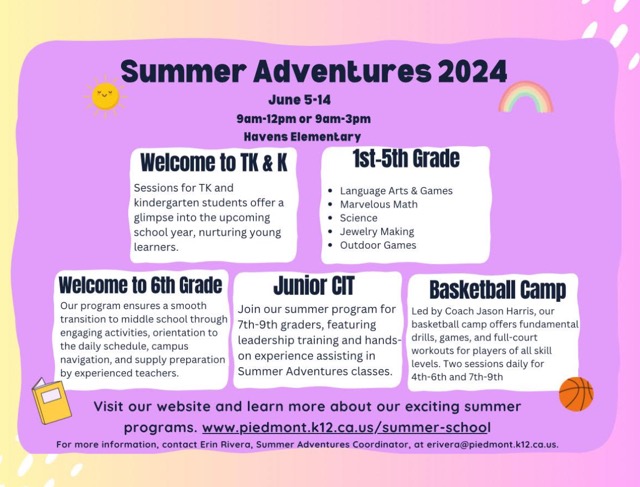 Spaces are limited, so don’t delay – secure your spot now and prepare for the ultimate summer experience! For more information and to register, visit piedmont.k12.ca.us/summer-school.