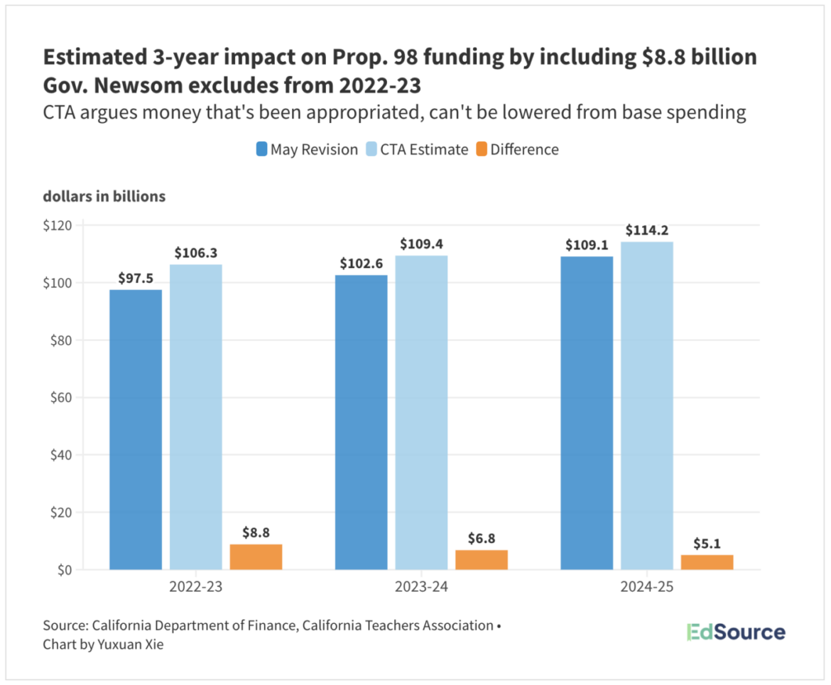 By CTA’s calculations, adding in the $8.8 billion and applying other Proposition 98 factors would raise funding for 2023-24 by $6.8 billion beyond what Newsom calls for in his May revision and $5.1 billion more in 2024-25.