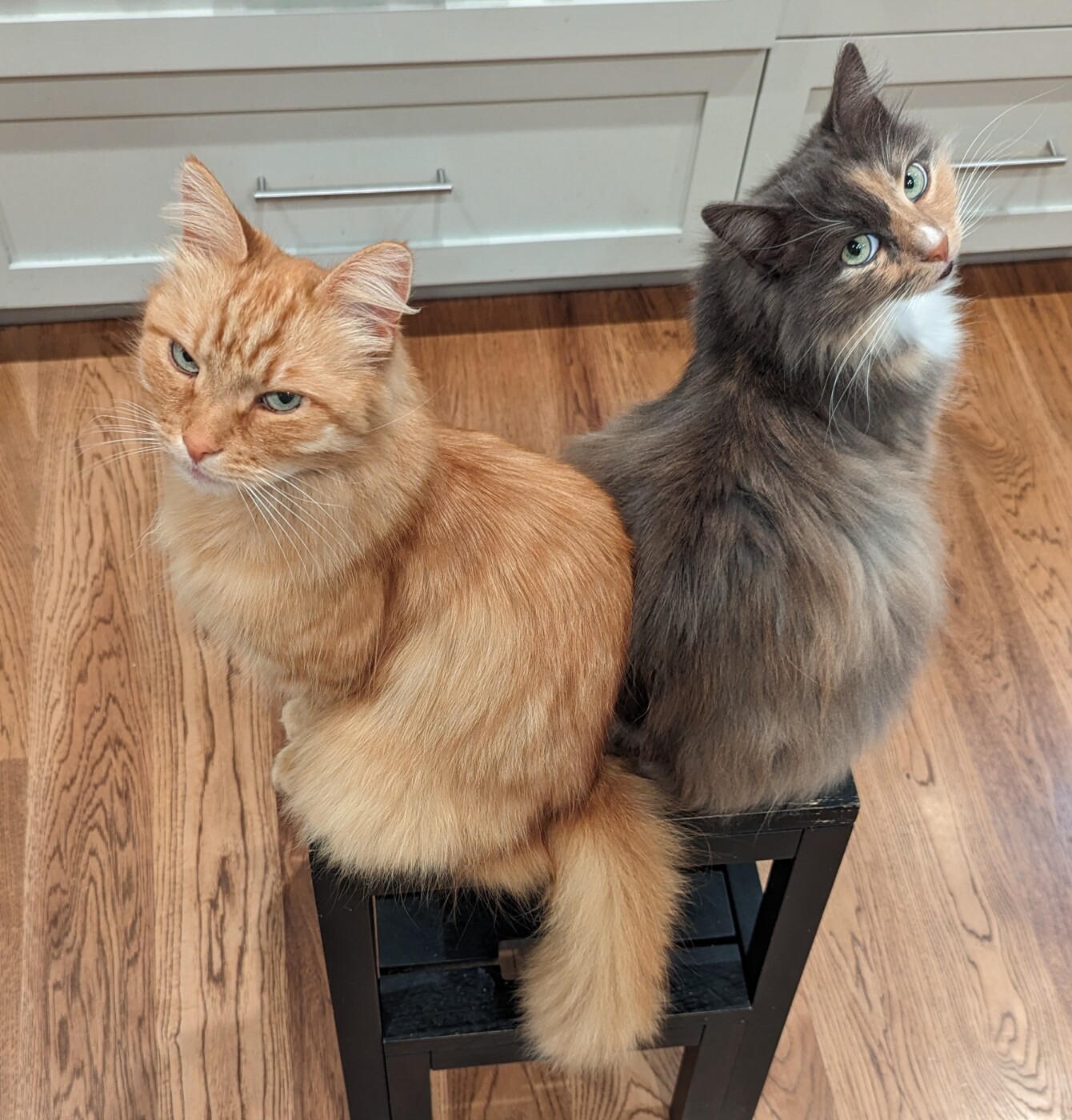 Breed: They are both Siberians. Some of us are allergic to cats and Siberians don’t have any (or as many) allergens in their saliva and dander.