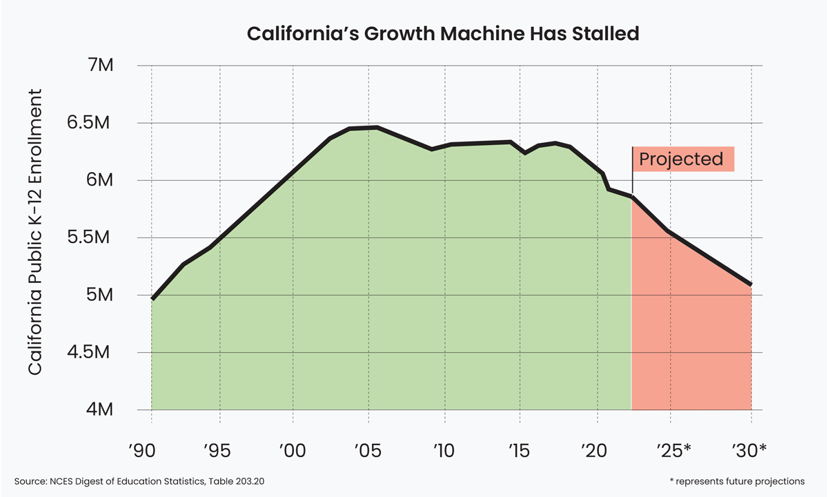 California public school enrollment passed the 5 million mark in 1991. That number quickly grew to 6 million by 1999 and then reached 6.4 million students in 2004.