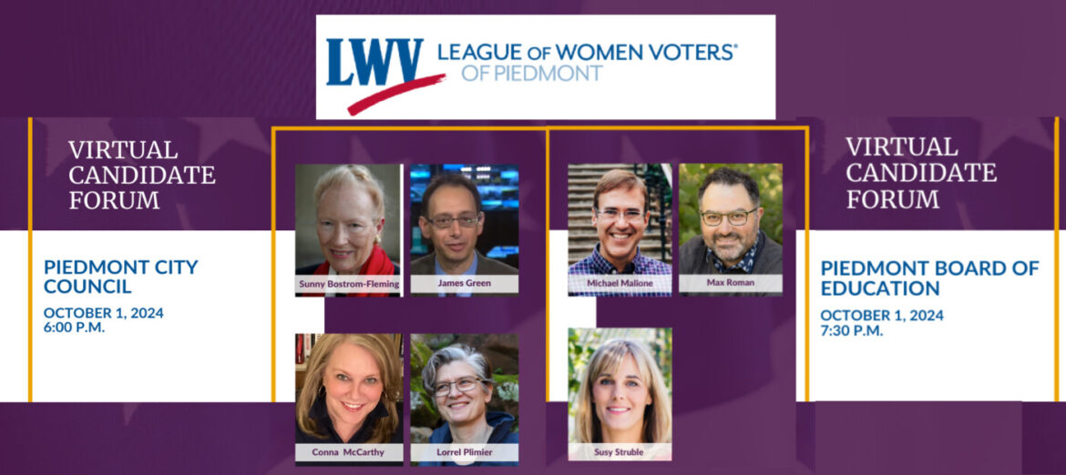 On Tuesday, Oct. 1,, 2024, the League of Women Voters Piedmont (LWVP) hosted two virtual candidate forums. Recordings of both forums are now available on the League’s YouTube channel, at https://www.youtube.com/@lwvpiedmont/videos.