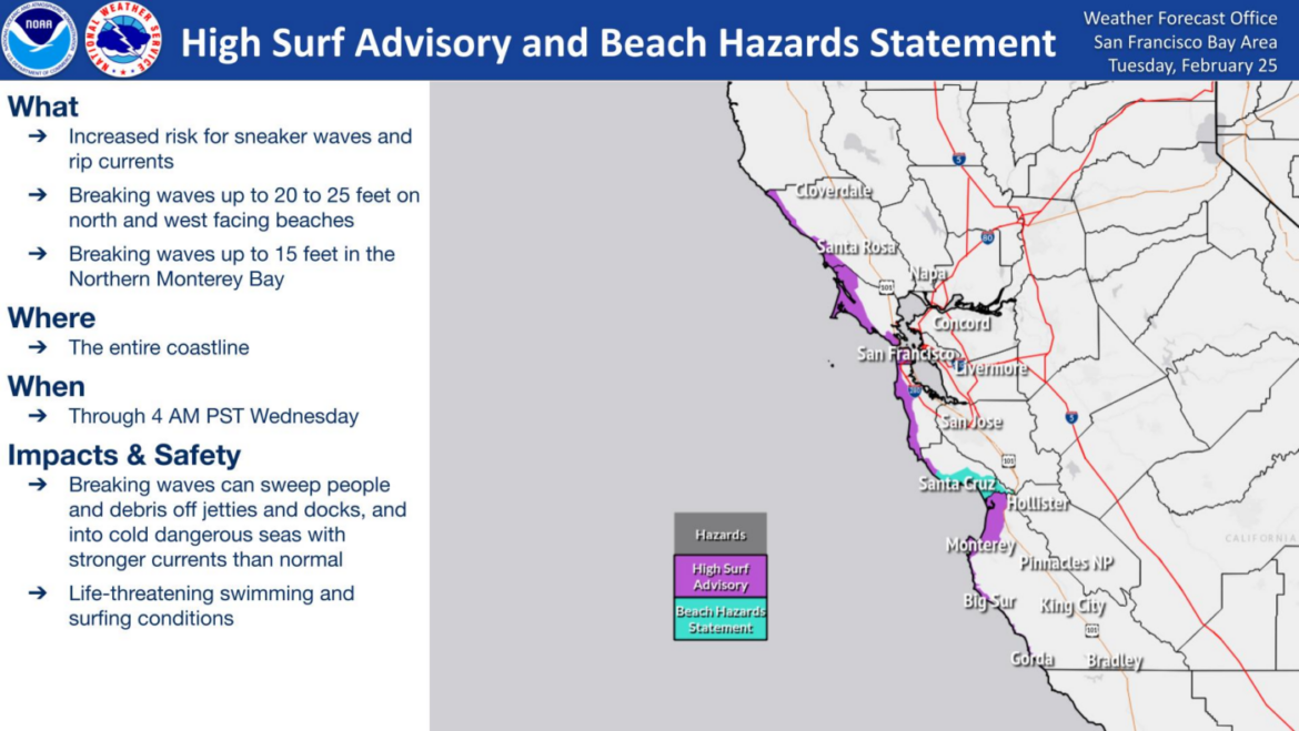 The biggest waves are expected along the Sonoma and Marin county coastlines, with swells diminishing late Tuesday and into early Wednesday.