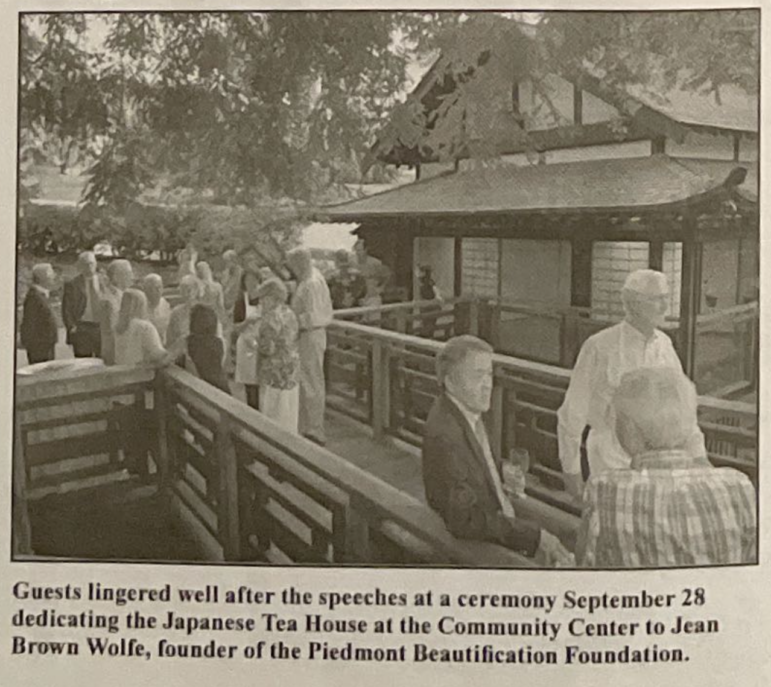 The idea to acquire, relocate, and restore the tea house came from the Piedmont Beautification Foundation and the Piedmont Garden Club. Both organizations made it their Bicentennial Project. Community leaders Jean Brown Wolfe, Marnie Winsor and Norma Wells helped make the idea a reality. Wolfe, president of the Garden Club and who had already served as chair of the park commission and president of PBF, convinced the City Council to accept the school district’s offer of the tea house.