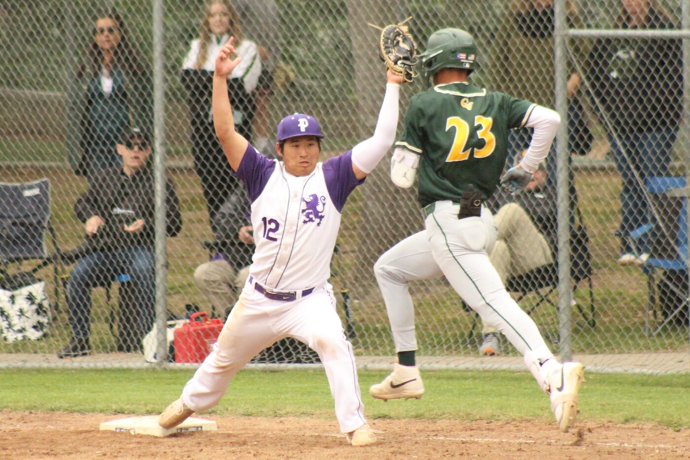 Piedmont coach Eric Olson (right) fist bumps Jordan Vo at third base during the Highlanders 5-0 loss to Castro Valley on April 23.