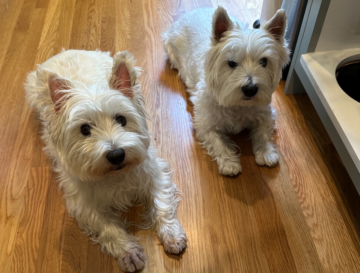 Likes: Poppy Rose tends to get into a bit of mischief. She loves to eat. Recently she had to have emergency surgery for a peach pit that was lodged in her small intestine — and we renamed her Peach Pit Poppy. You may have seen her around town with a Fox Tail net around her head to keep her from accidental ingestions. She also likely thinks she is a golden retriever as she loves to fetch. Both Westies love to be held and they love to cuddle. They are adorable when they cuddle together.