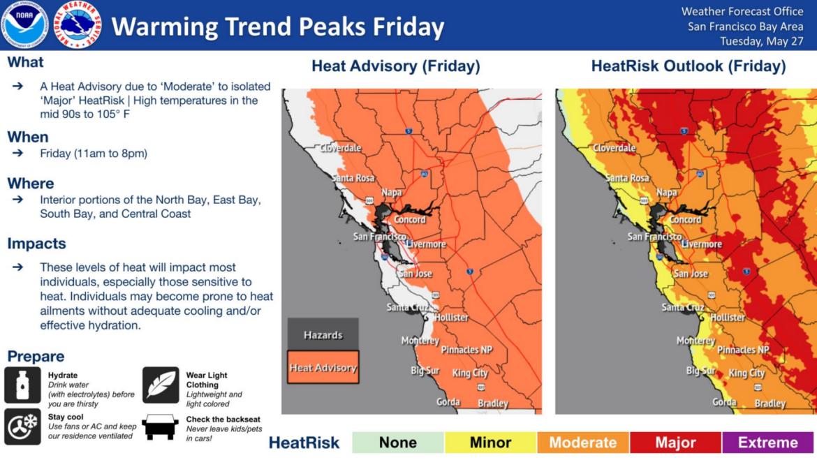 A very strong ridge will build rapidly by Thursday along the West Coast from central California northward into the Pacific Northwest interior, peaking at record strength (for late May) on Fri/Sat. Meanwhile, a notable low pressure system will develop directly south of California — forming what is known as a “Rex Block” pattern. As it does so, Northern CA will experience rapid warming to well above average and in some cases record-breaking levels by Friday. Widespread daily record highs will probably be set across most of interior northern and central CA on Fri/Sat, with even a handful of all-time monthly records possible in hotter parts of the Sacramento Valley and surrounding foothills (including Redding at ~110F). It’ll be pretty hot in SoCal, too, but probably not record warm, and just how close to the coast the heat will get in NorCal is still somewhat uncertain (although even just a few miles inland, it’ll get very hot indeed). Widespread Heat Advisory products are out from the NWS for much of NorCal during this event.