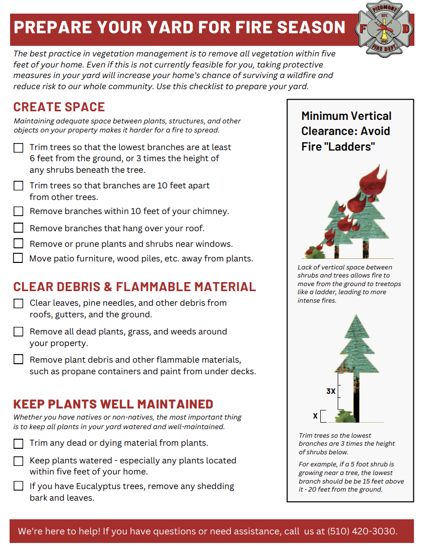 As the weather turns hotter and vegetation dries out, the Piedmont Fire Department urges residents to prepare their yards for fire season by trimming trees and shrubs, clearing flammable materials, and removing dead vegetation around their property. Even if you took these steps earlier this summer, it’s a good idea to do another round of clearing as fall nears.